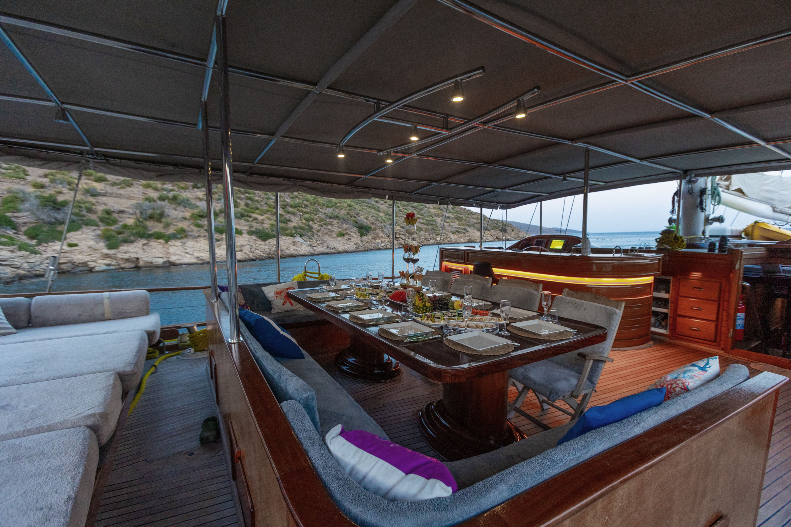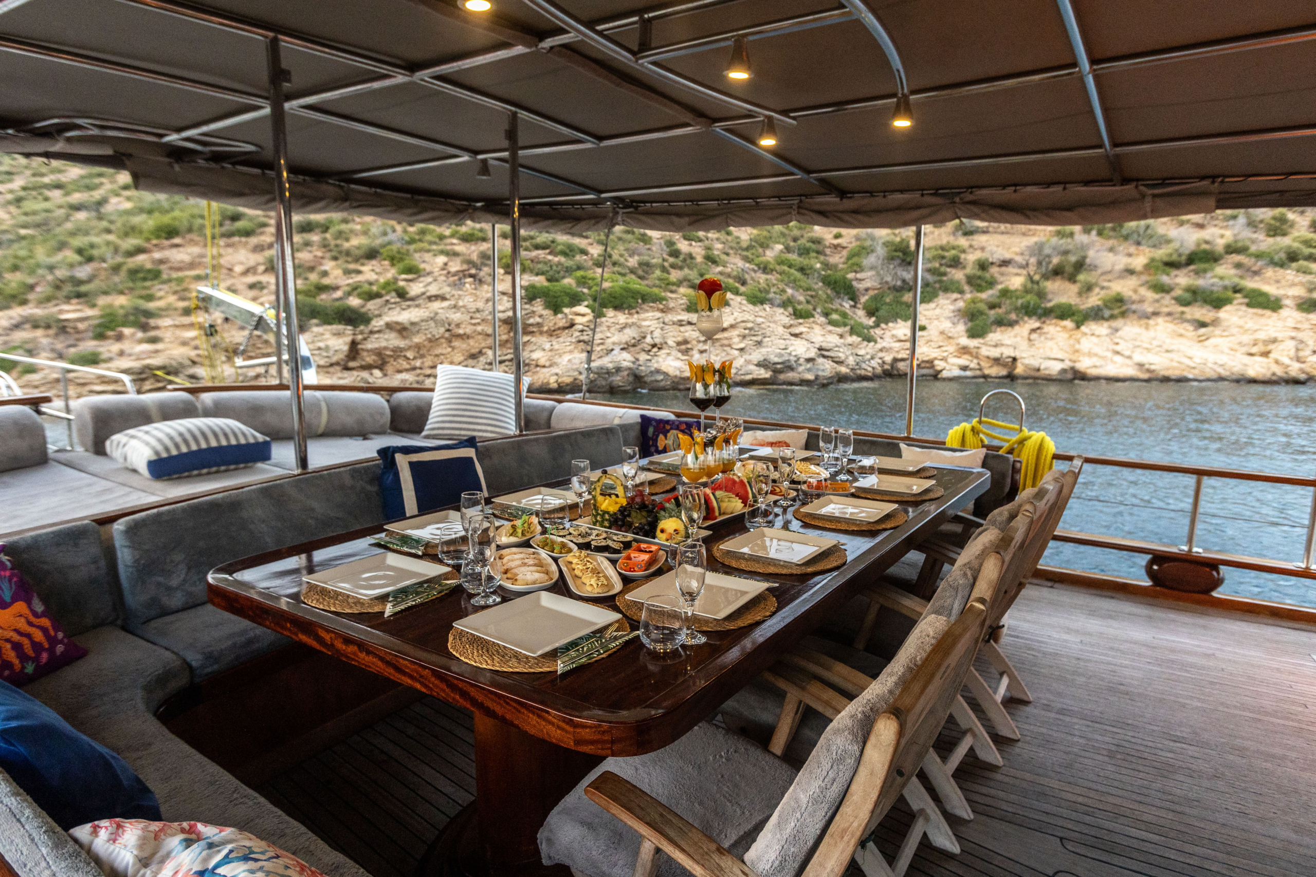 Relax on the expansive deck under the Mediterranean sun, enjoy alfresco dining with panoramic sea views, or unwind in the stylish interior lounge.